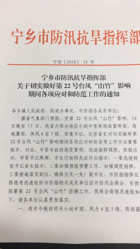 宁乡市防汛抗旱指挥部关于切实做好第22号台风“山竹”影响期间各项应对和防范工作的通知