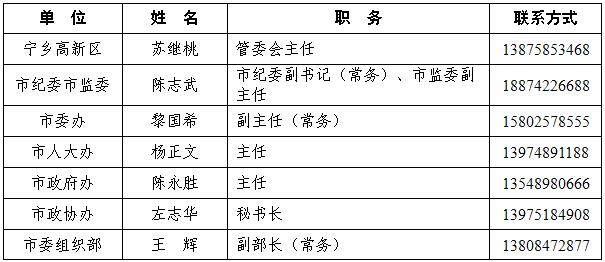 此外,宁乡市委、市政府还提供了24小时市民服务热线:12345和法定工作时间的监督电话:市纪委市监委,0731—88980957;市委组织部,0731—88980558。