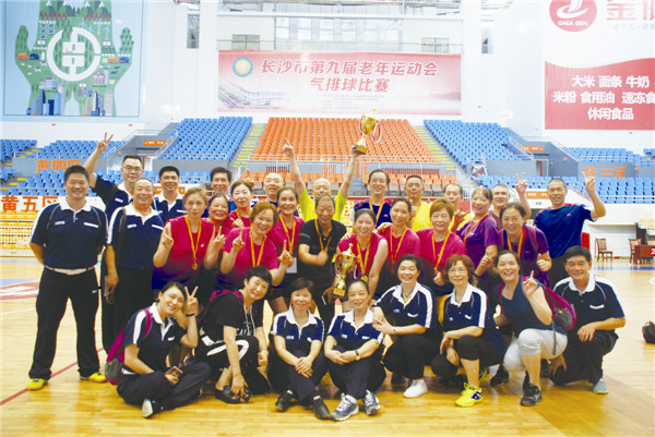 9月19日,长沙市第九届老年人运动会气排球比赛宁乡市代表队囊括男女冠军。图为队员合影。本报实习记者 陈燕 摄