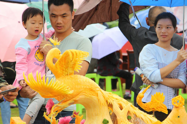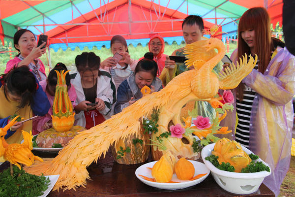 今日,在位于宁乡市的湖南湘都生态农业园内,一场由20万斤红南瓜打造的“南瓜宴”,堆砌成的南瓜墙,制作的南瓜食雕,以及众多以南瓜为主题的趣味运动,吸引了附近2000多村民冒雨参观体验,一同欢庆首个“农民丰收节”,共同品味收获的喜悦。