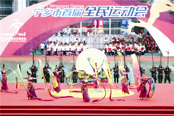 开幕式上,文体展演分“历史宁乡”“运动宁乡”“希望宁乡”三个篇章进行。在“历史宁乡”篇章,大禾盛世、红色宁乡、腾飞宁乡三个节目表演场面宏大,再现了宁乡悠久的青铜文化和红色文化;在“运动宁乡”篇章,舞龙舞狮、自行车骑行表演、足球表演秀、广场舞等一一上场,宁乡丰富多样的民俗运动和群众体育活动得到精彩呈现,展示了宁乡人爱运动的精神风貌;在“希望宁乡”篇章,几百名演出人员一起载歌载舞,以欢乐的歌舞体现宁乡人的幸福生活。三个篇章紧密衔接,整场演出浑然天成,展现了世世代代的宁乡人为了梦想不畏艰辛、上下求索、开拓进取的精神。