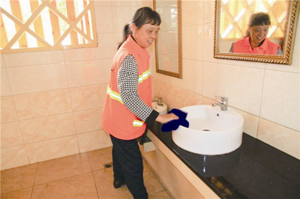 “童大姐做事很细致,公厕外墙、窗户玻璃等徒手抹不到的位置她都用特制的工具进行抹洗,地面上每天都是光洁照人,我认为这是宁乡最干净、最漂亮的公厕!”在迎宾广场的园林工作人员这样说。