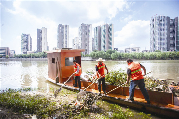 2018年,水域保洁小组以“除臭剿劣”、“碧水蓝天保卫战”两大战役为背景,全面加强“三溪一渠一江”165.2万平方米水域清捞工作,全年清理水域污泥、杂草、垃圾共计4000吨。水域卫生保洁实现常态化作业,清澈的河水,生态的水源是他们工作最好的回报!”