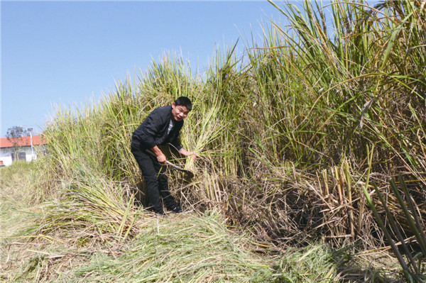 欧意军拿柴刀砍巨型稻。本报记者 邬艳 摄