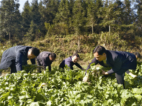 ▲玉潭街道干部到贫困户喻国军家菜地帮忙拔萝卜,并予以收购。