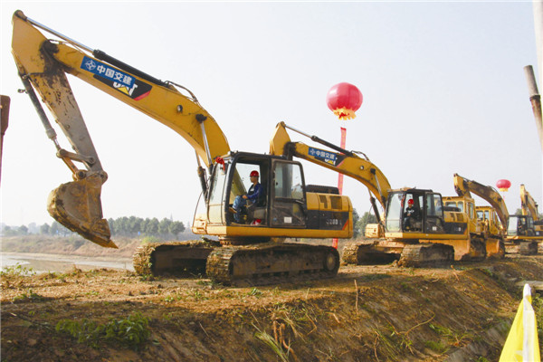 项目现场,数十台工程机械整装待发。本报记者 刘汉光 摄