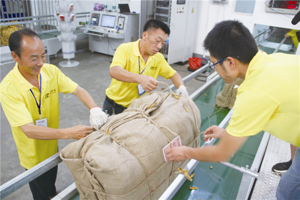 ▲研制烟叶打包推送机构,有效解决了传统收购打包效率低、打包质量差的问题。