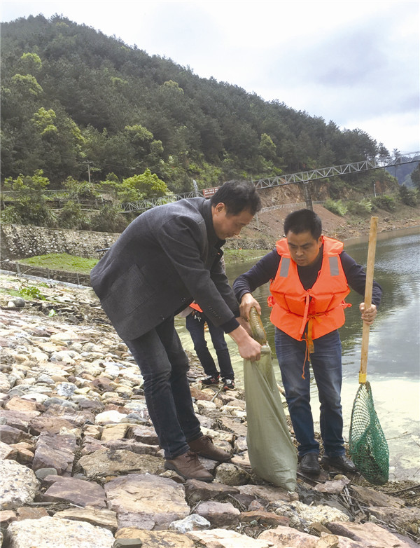 碧波荡漾,绿树葱笼。走上黄材水库大坝护堤,缕缕清风迎面吹来,让人心旷神怡。今日黄材水库的美景,离不开我市对水源地保护的高度重视,也离不开一群默默坚守在库区的护水人。近日,记者在黄材水库大坝见到黄水局大坝管理所支部委员吴国求时,他正和所里10几名同事一起,打捞岸边的垃圾和杂物。