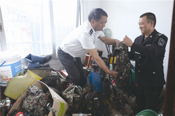 渔政执法人员正在整理收缴的电鱼机。本报记者 龚再蓉 摄