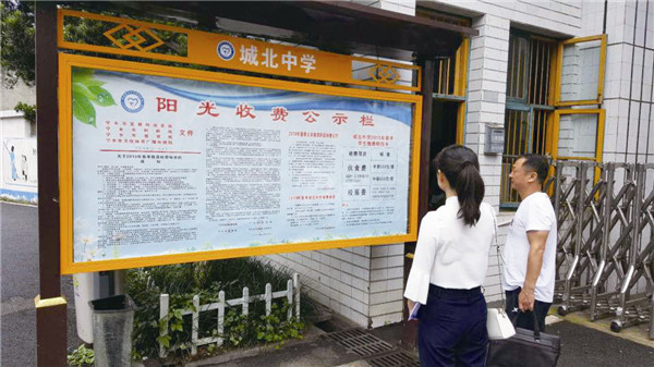 图为教育扶贫专项治理检查组在城北中学检查收费公示栏情况。