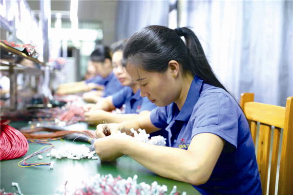 “这里的工作对技术要求不高,只要是视力好、动作快都可以来,多劳多得。”灰汤村驻村第一书记李波告诉记者,扶贫车间于今年3月开始筹建,于5月8日正式生产,共设立一条生产线,主要产品为电脑连接线和电器内接线及周边配线,主要工序包括前检、穿壳、绞线、绑带、电测等。