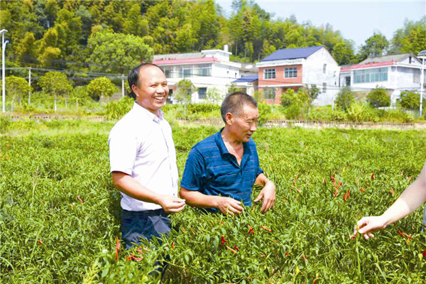 李畅生(左一)在朝天椒基地察看第二茬朝天椒的长势。范婷 摄