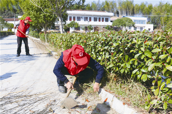 图为青山桥镇竹峰村党员和普通村民正在自发打扫村道卫生。