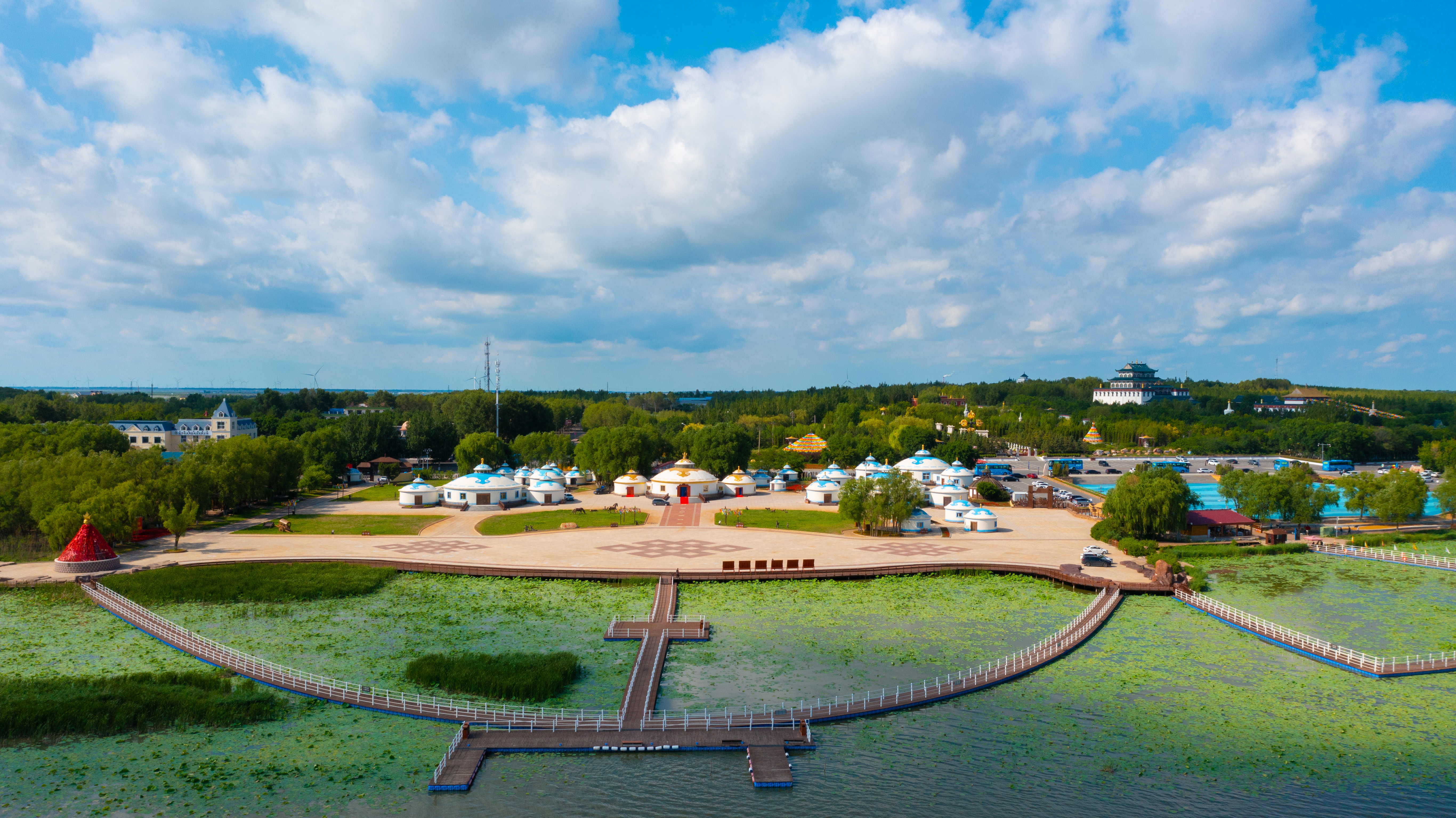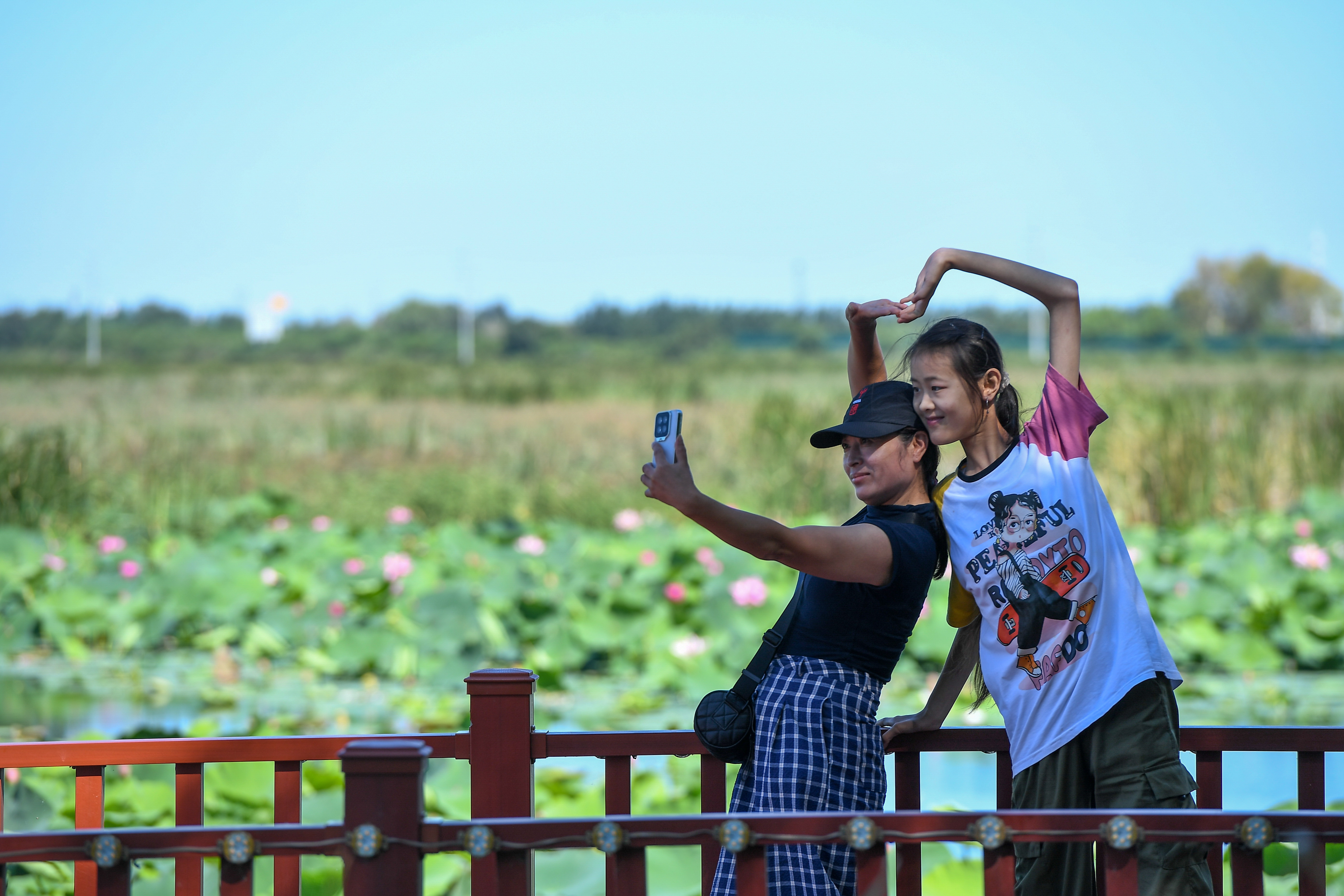 2024年8月26日,游客在查干湖拍照留念。参考冬捕节的成功经验,当地在春、夏、秋季分别举办捺钵开湖节、圣湖荷花节、湿地观鸟节等节庆活动,打造“四季的查干湖”。