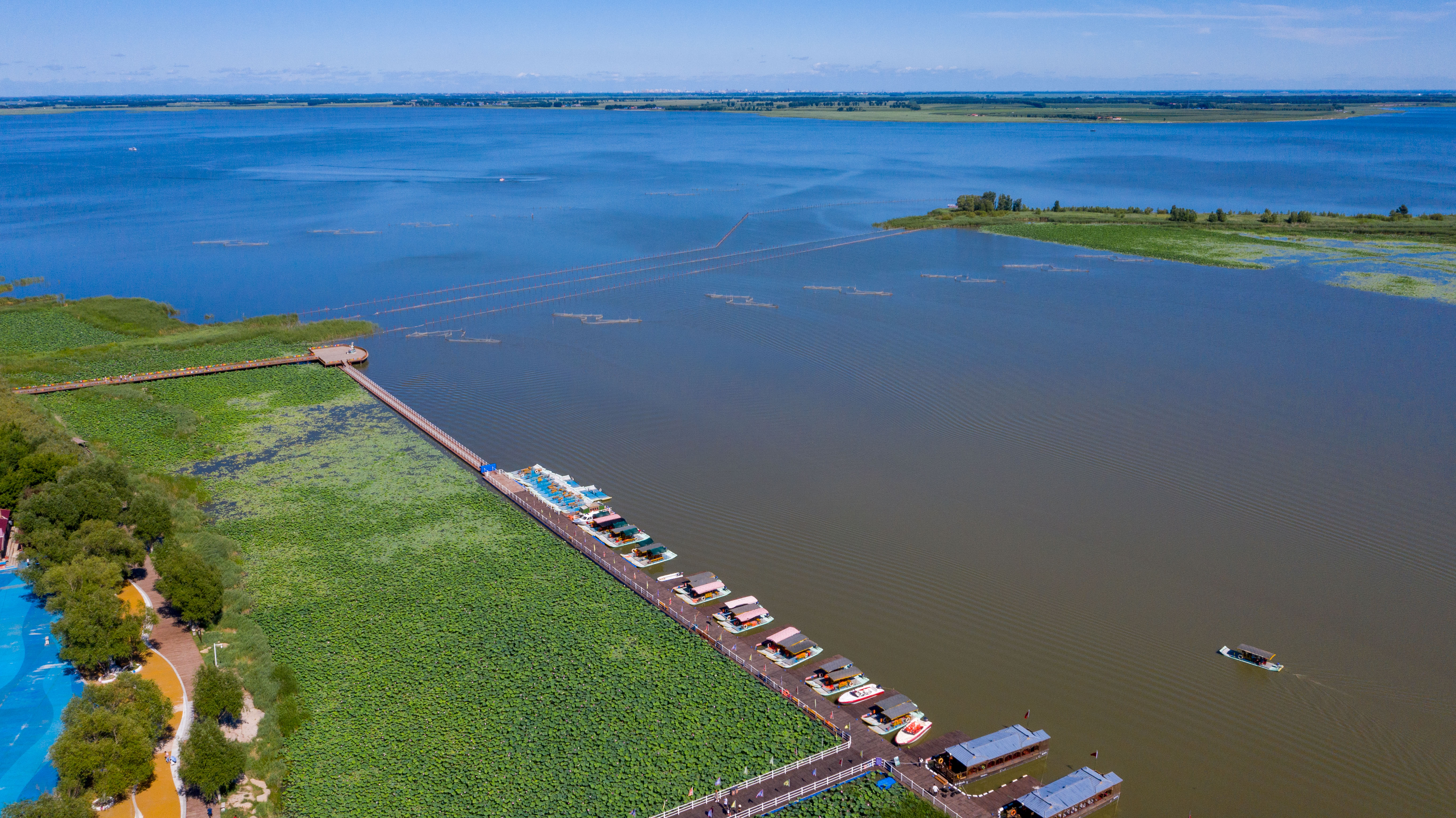 2020年7月20日拍摄的查干湖湿地。查干湖通过一系列工程性、生物性和管理性措施,不断扩大湿地面积,维护湿地生态平衡。截至2025年2月,查干湖实施湿地保护与恢复等项目24个,通过河道治理、引水灌溉、生态修复等工程,调配利用洪水资源和灌溉回归水,实现“松花江—查干湖—嫩江”水体连通和动态循环。