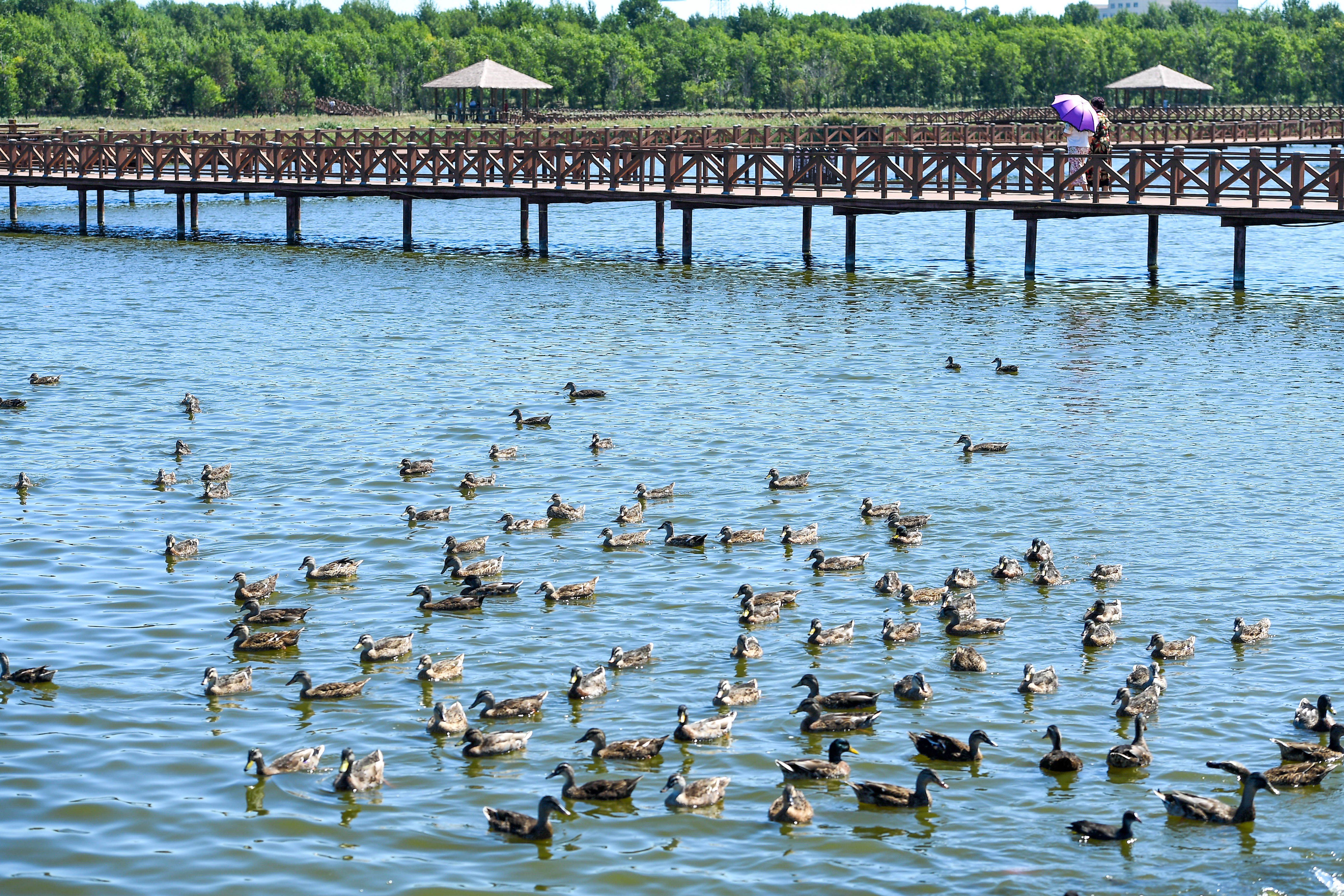 2024年8月26日,游客在查干湖野鸭岛游览。截至2025年5月9日,查干湖实施湿地保护与恢复项目24个,保护区湿地面积达517.2平方公里,成为全球九大候鸟迁徙路线的“能量补给站”。随着观鸟、拍鸟热潮兴起,“观鸟经济”为当地文旅注入新活力。