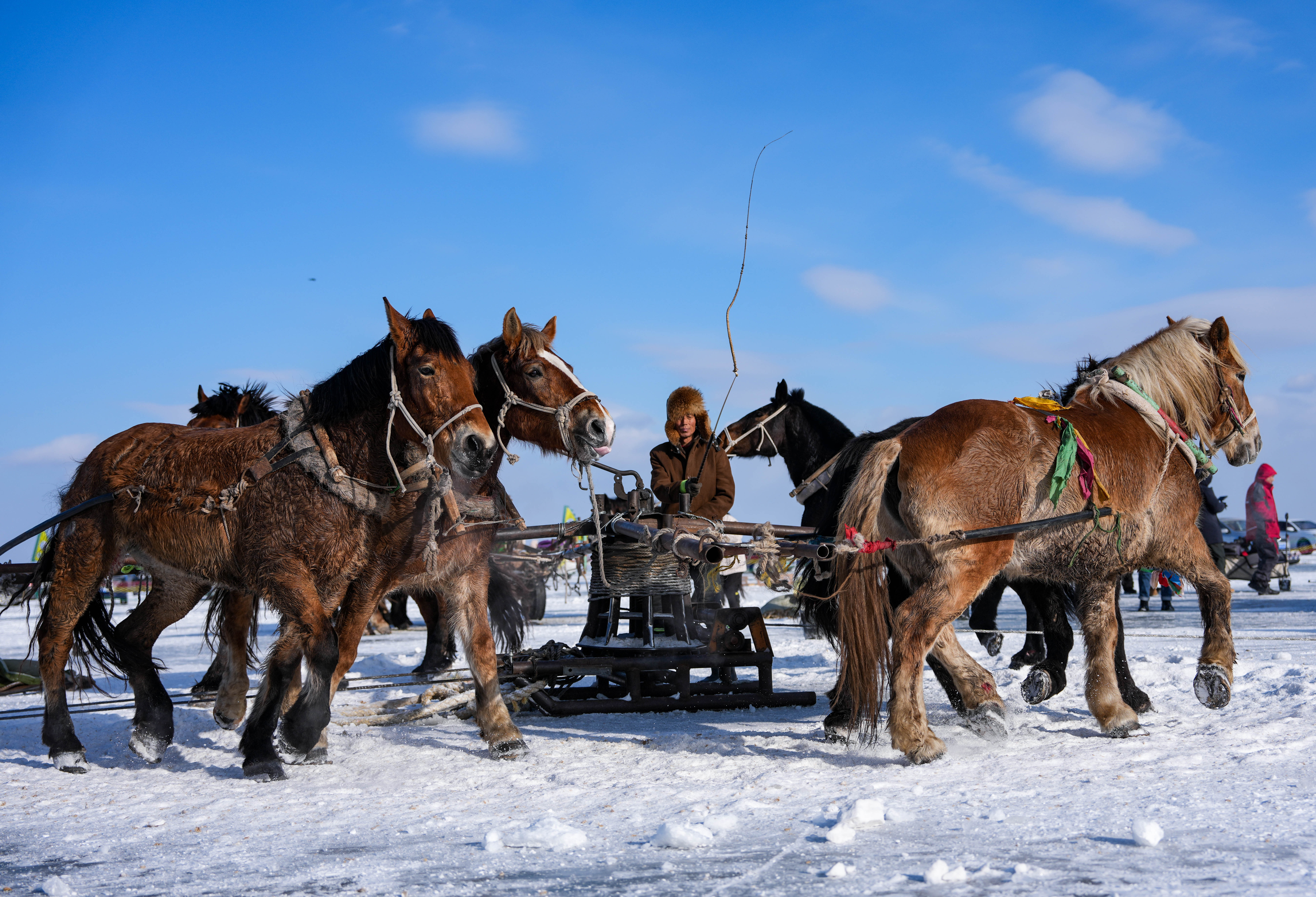 2026年1月7日,渔民通过马拉绞盘将渔网拖出查干湖冰面。