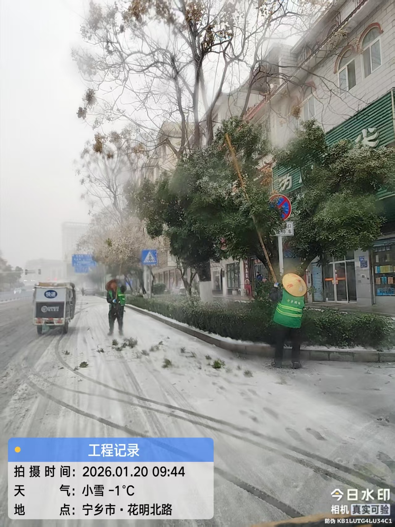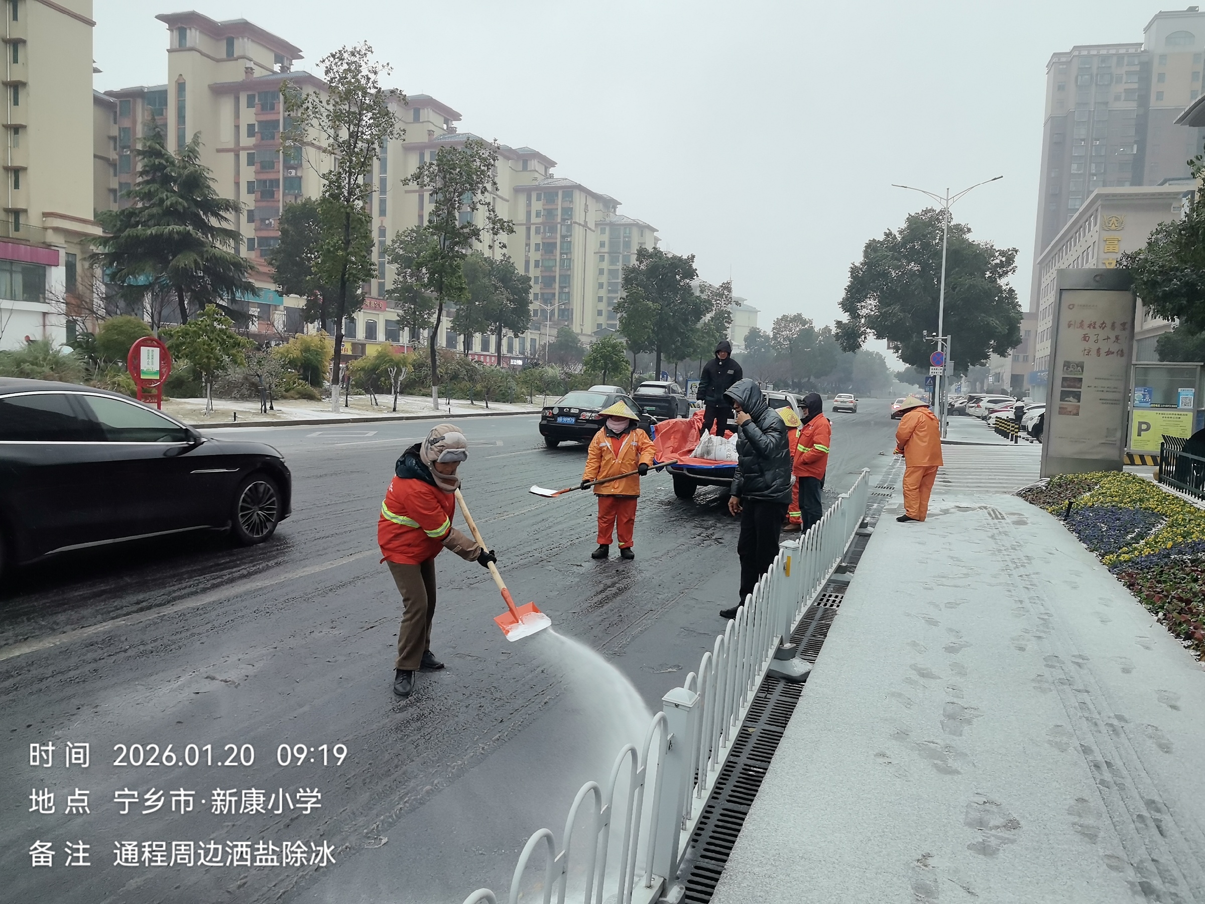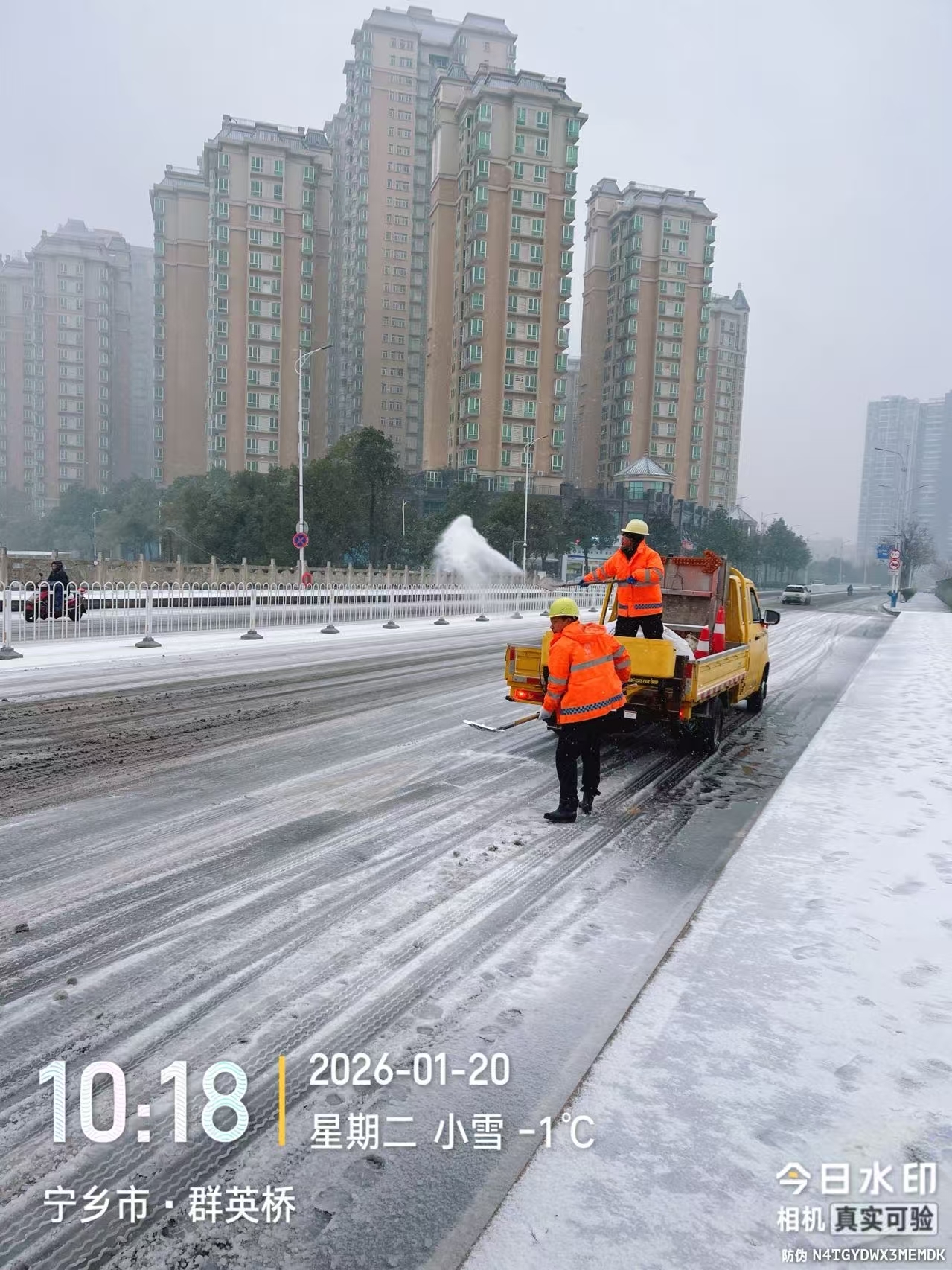 红网时刻讯(通讯员 张宏艳)1月19日凌晨,受强冷空气影响,宁乡市迎来新一轮低温雨雪冰冻天气。气温骤降,雨雪交加,给城市运行和市民出行带来了严峻挑战。为扎实做好应急应对工作,有效降低冰冻降雪带来的不利影响,市城管系统迅速响应,第一时间启动应急预案,全体工作人员闻令而动、迅速到岗,毅然投身到除雪融冰第一线,用“城管蓝”和“环卫橙”在风雪中筑起了一道温暖防线,全力守护人民群众的生命财产安全。
