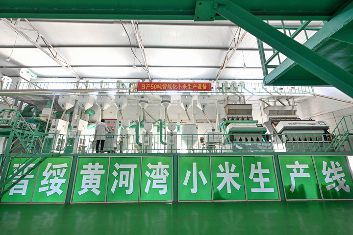 2025年7月1日拍摄的山西省吕梁市兴县晋绥黄河湾农业开发有限公司的小米生产线。抗战时期,地处晋西北地区的兴县和静乐县是晋绥抗日根据地的一部分。新华社记者 李鑫 摄